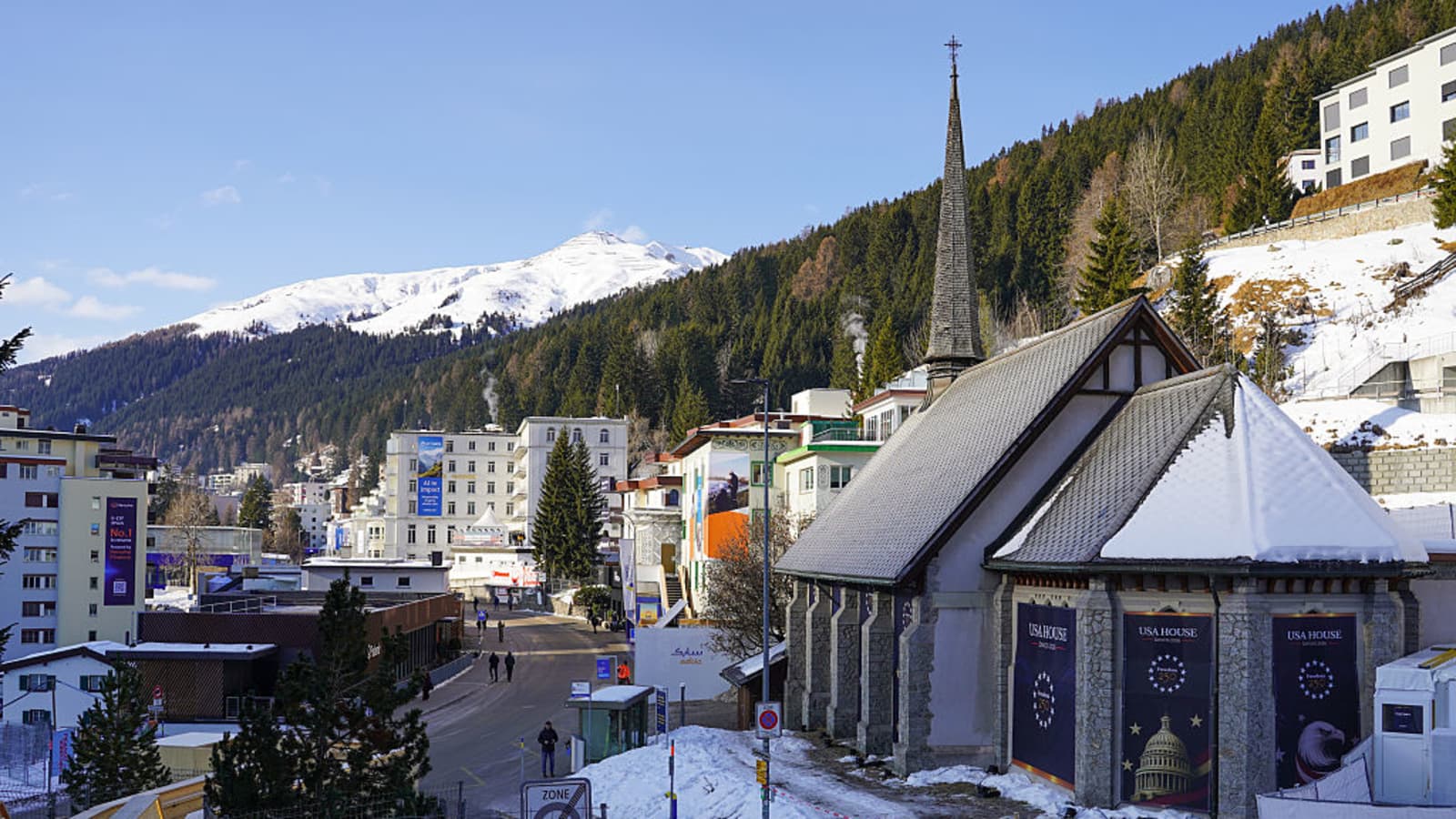 The USA House is prepared ahead of the World Economic Forum on January 18, 2026 in Davos, Switzerland. The annual WEF meeting brings together leaders from government, business and civil society to discuss major global issues. This year’s edition is taking place from January 19 to 23.