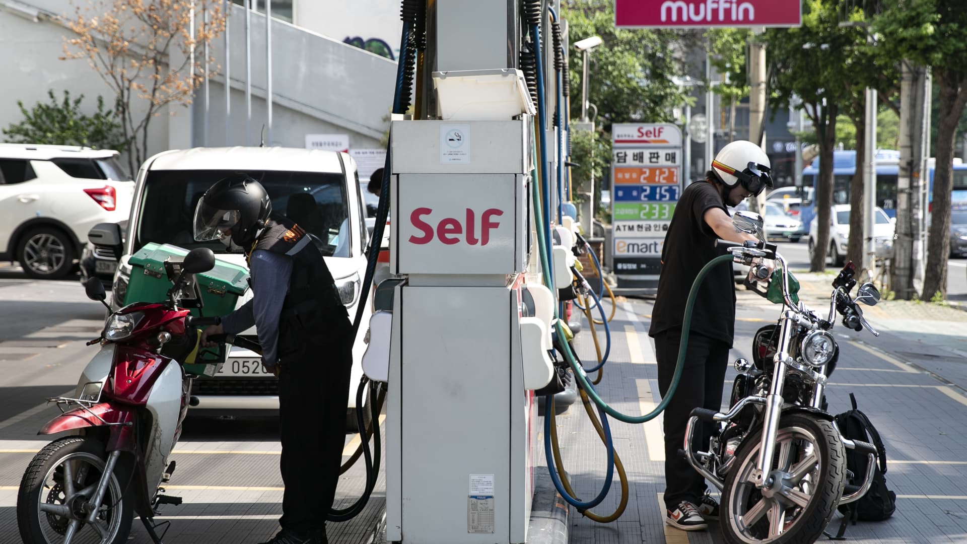 Riders refuel their motorbikes at a gas station in Hongdae district in Seoul, South Korea, on Saturday, July 2, 2022.